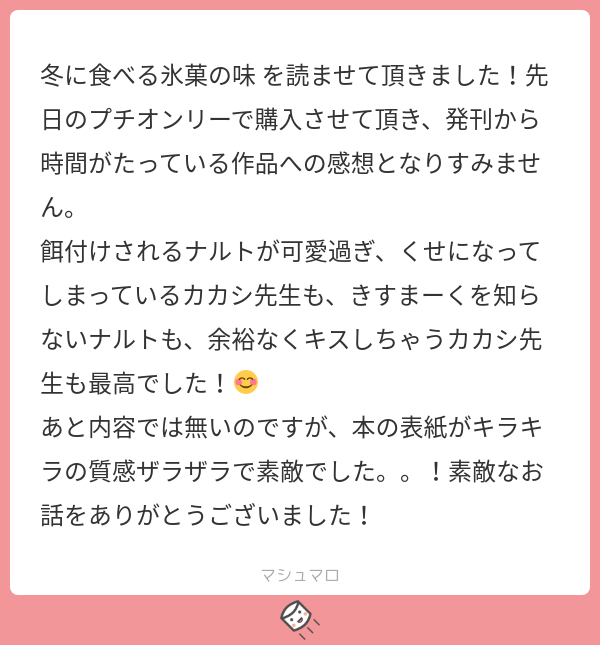 初本となるこの本はナルトもカカシもとにかくピュアで、正直くだらない内容でギクシャクさせてくっつけてみました。
